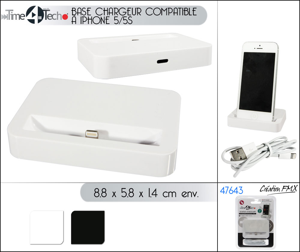 Base chargeur compatible à Iphone 5/5S avec câble USB fourni 2 couleurs au choix : Noir, et blanc Longueur du càble : 1m env. Dimensions de la base : 8.8*5.8*1.4cm env. Emballage : Double Blister (FMX) / set