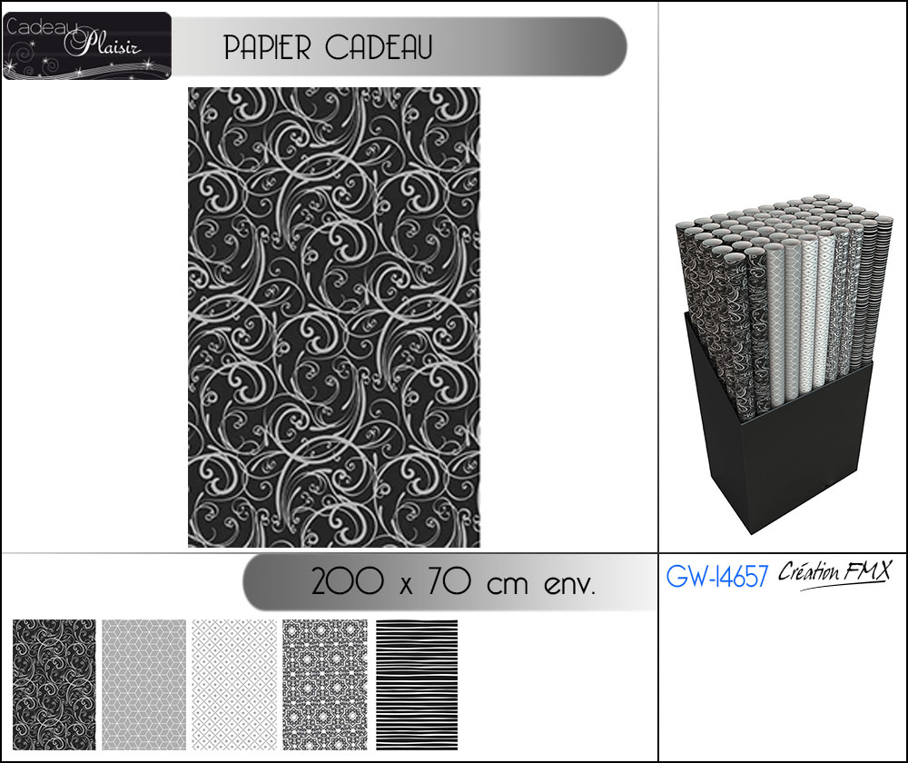 Papier cadeaux thème Noir et Blanc - 5 asst Taille: 200x70 cm 60 rouleaux par présentoire Emballage: présentoire de 60 rouleaux
