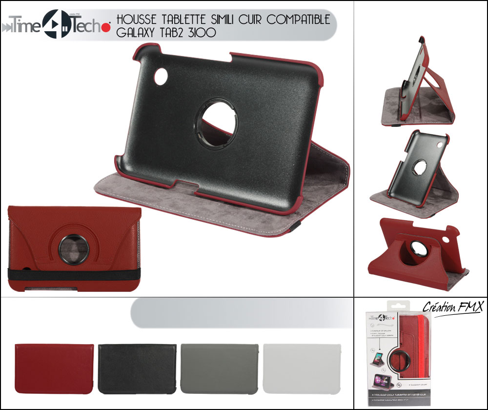 Housse tablette simili cuir compatible GALAXY TAB2 3100 (7 pouces) / 4 couleurs asst. Plus produit : élastique de sécurité, 2en1 (housse et porte tablette) Coloris : blanc, noir, gris, bordeaux Emballage : Boîte PVC + Insert card