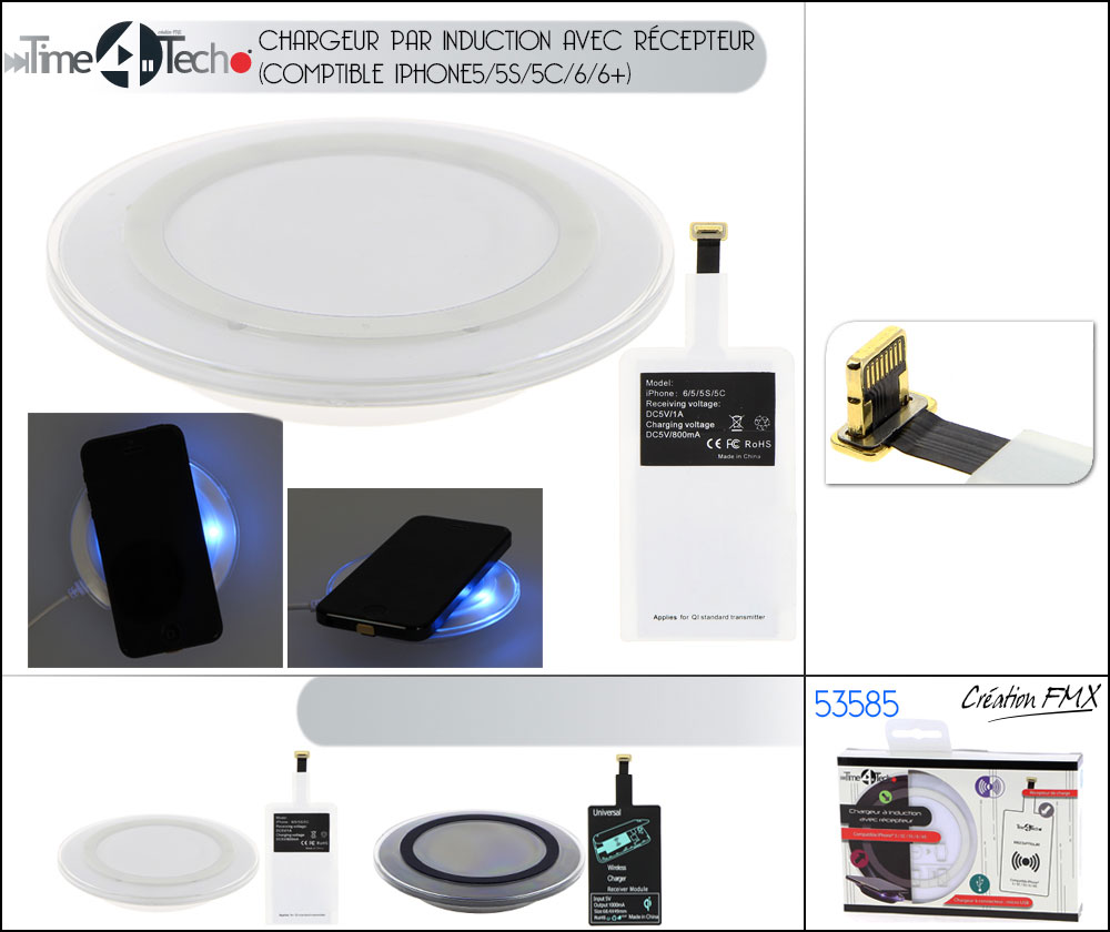 Chargeur par induction avec récepteur (comptible Iphone5/5S/5C/6/6+) / 2 couleurs asst. 2 couleurs au choix : Noir, et blanc Paramètres du chargeur: * Dimensions du chargeur: 9.2x9.2x1.5cm env. * Transmission d'énergie sans fil avec la technologie QI * Tension d'entrée : 5V/2A; Tension de sortie: 5V/1A * Connecteur d'entrée: Micro USB * Longueur Câble: 80cm env. * Efficacité de charge: >70% * Poids net: 85Grs. env. * Indication light: Blue LED’s Paramètres du récepteur: * Dimensions: 10.7*4.4*0.15cm env. * Reception d'énergie sans fil avec la technologie QI * Tension de sortie: 5V/1A * Courant de chargement: DC5A/800mA * Puissance de chargement: 5W * Poids: 5.5Grs. ± 0.5g * Distance maximale avec le chargeur: 5mm * Comptible Iphone5/5S/5C/6/6+ Emballage : Boîte couleur fenêtre PVC (FMX)