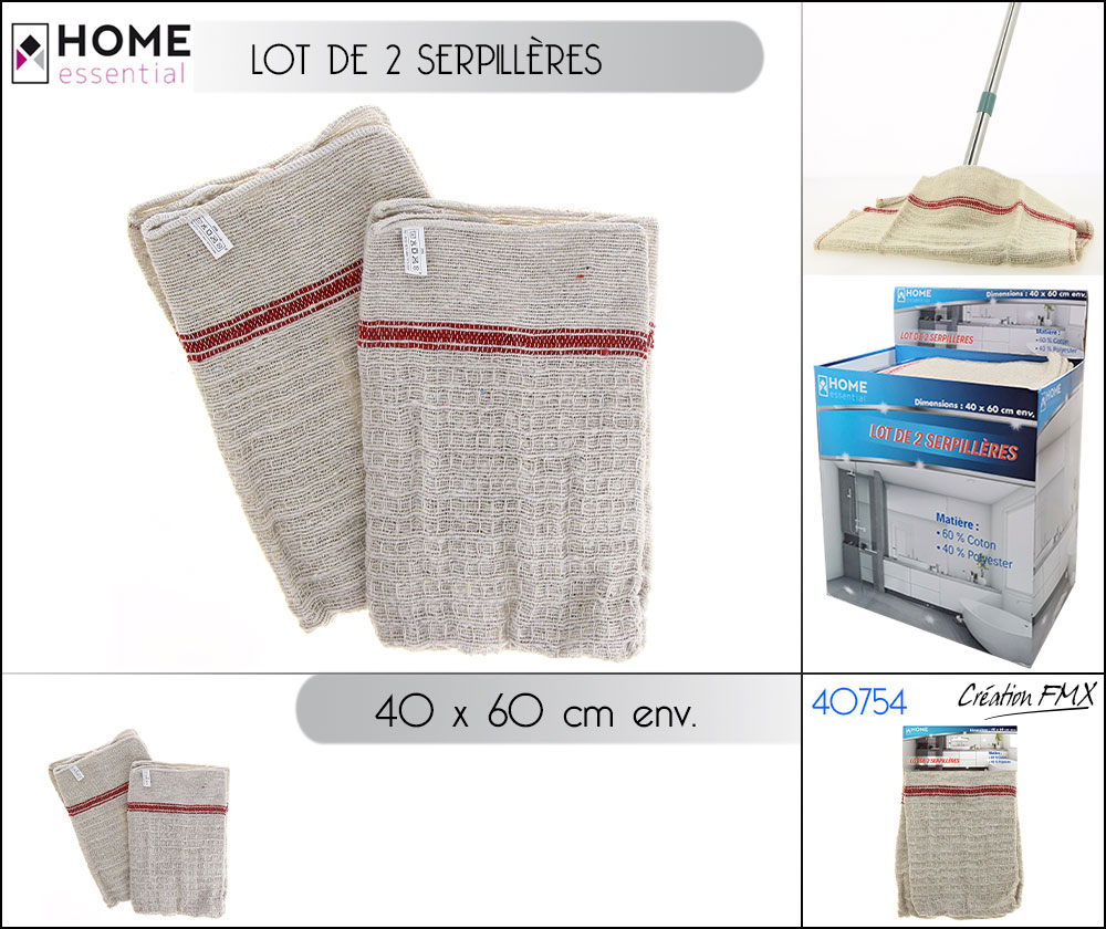 SERPILLIERES x 2 (40X60 CM) material: coton 60%, polyster 40% MATIERE: COTON POIDS: 190G/LES 2 PCS. COUL NAUTRE. EMB: HEADER CARD + PLANE HOLE A/W FOMAX. 36 PCS/COLOR DISPLAY A/W FMX.